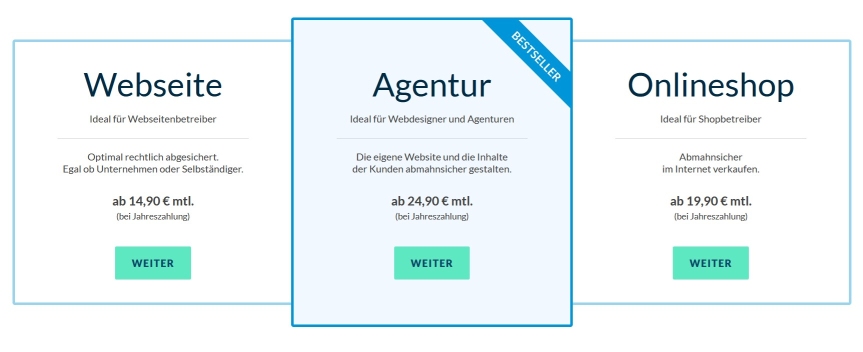 eRecht24 eignet sich für Webseitenbetreiber, für Webdesigner und Agenturen sowie auch für Shopbetreiber. Dementsprechend kann man auch zwischen drei kostenpflichtigen Paketen wählen, die sich dann nochmal in Basic, Business sowie Enterprise spalten: